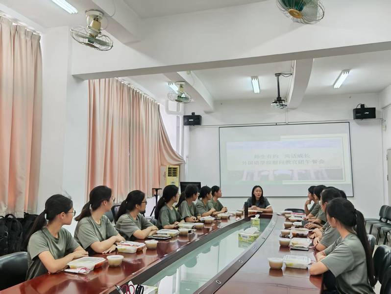 为保障2025级新生军训工作有序进行,提振教官队伍士气,外国语学院于2025年9月3日中午在院楼607会议室举办慰问教官团午餐会。学院党委副书记杨宇姣、25级辅导员唐露怡及外语中队教官团全体成员出席了午餐会。