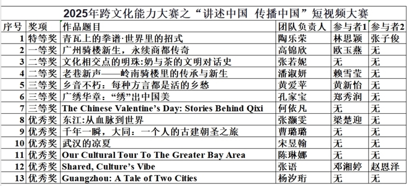经个人或团队提交材料,学院英语系组织评审,2025年“外教社杯”全国高校学生跨文化能力大赛之“讲述中国 传播中国”短视频大赛校园选拔赛已顺利完成评审工作。依据赛事通知规则,经校内评委不记名评审并综合考量作品质量,现将获奖结果公布如下: