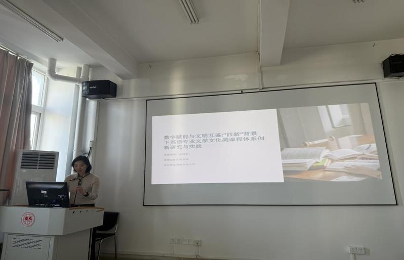 报告会上,侯金萍老师就其课题《数字赋能与文明互鉴:“四新”背景下英语专业文学文化类课程体系创新研究与实践》进行了阐述。该课题直面“四新”建设背景,旨在探索数字技术如何赋能英语专业文学文化类课程,通过体系重构与教学创新,促进文明交流互鉴能力的培养。