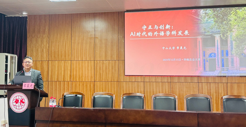 2025年12月15日下午,中山大学常晨光教授应邀在外国语学院5A402报告厅开展了题为《守正与创新:AI时代的外语学科发展》的学术讲座。本次讲座由外国语学院执行院长邓飞教授主持,吸引了全院师生踊跃参与。