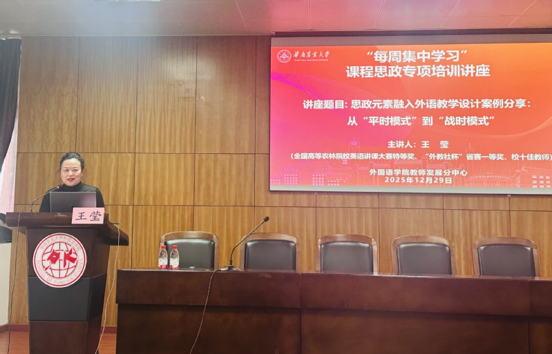 此次讲座特邀本院王莹老师作题为《思政元素融入外语教学设计案例分享:从“平时模式”到“战时模式”》的专题讲座。王莹老师曾荣获2025年第五届全国高等农林院校英语讲课大赛特等奖、2025年“外教社杯”全国高校外语教学大赛广东赛区视听说组一等奖,并多次在国家级、省级教学竞赛中斩获佳绩,亦是校级“十佳教师”及“教书育人”先进个人。她长期致力于外语教学与研究工作,其教学设计以创意新颖、思政融入自然、学生参与度高而著称。