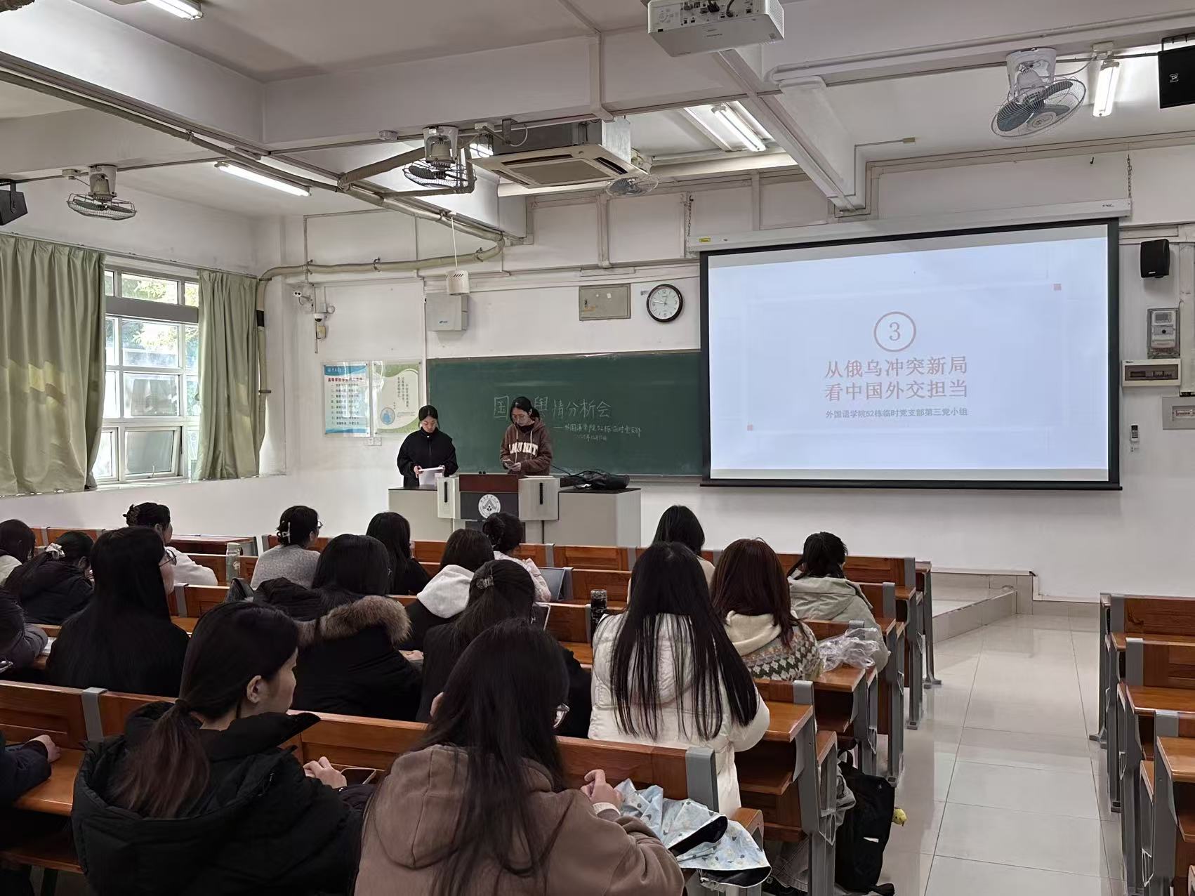 为了更好拓宽社区党员国际视野,提高社区党员综合素质,发挥党员先锋模范作用,根据外国语学院党委社区党建工作方案安排,12月15日中午,外国语学院启林北52栋临时党支部在第五教学楼B205教室开展党员国际舆情分析会。学院社区党建工作指导老师许航通以及支部全体学生党员共同参加了此次分享会。